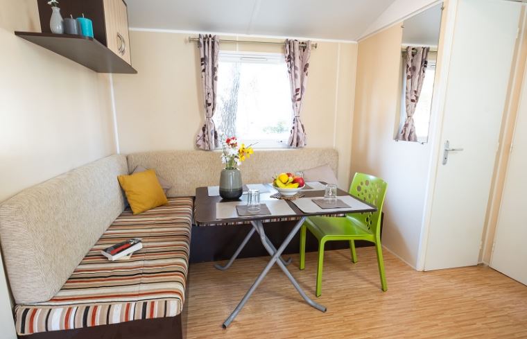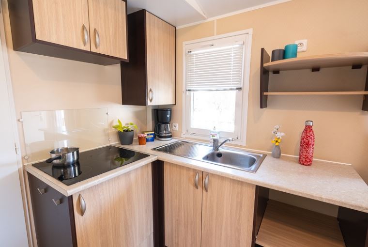 31m² - Terrasse– CUISINE : Evier – Cafetière filtre – Plaque de cuisson (4 feux) – Micro-ondes – Réfrigérateur